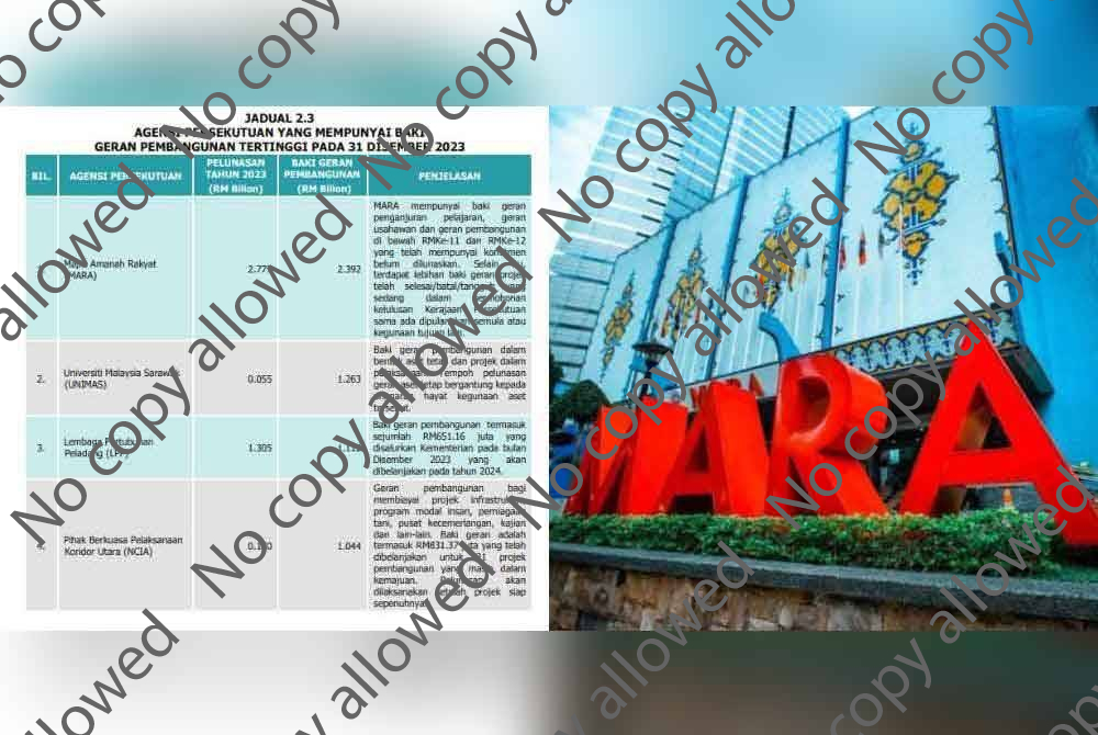 Berdasarkan Laporan Ketua Audit Negara (LKAN) 1/2025: Penyata Kewangan Agensi Persekutuan 2023 yang dibentangkan di Dewan Rakyat pada Isnin, Mara memiliki baki geran penganjuran pelajaran, usahawan dan pembangunan di bawah Rancangan Malaysia Ke-11 (RMK11) dan RMK12 yang sudah mempunyai komitmen tetapi belum dilunaskan.